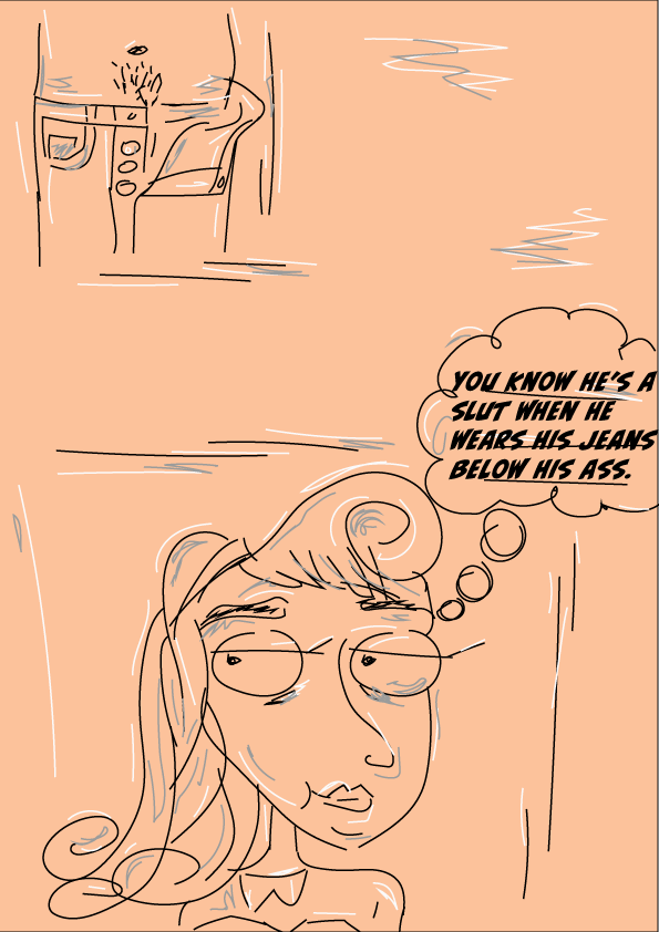 The next sketch I started to think about what the first page could be. I just started sketching random things and this is the first one that I came up with. The thing I like about this is that I have used different proportions which really reminds me and gives me comic book feeling. The other thing is the most obvious one which is the text bubbles.
